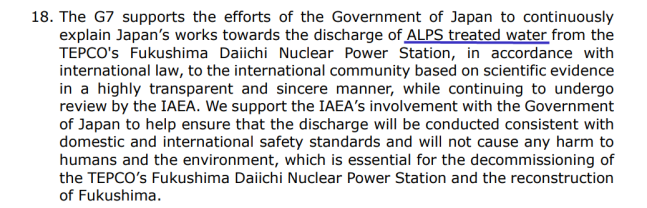 대만은 정부 문건에서 ‘삼중수소 함유 폐수(含氚廢水)’라는 보다 구체적인 표현을 쓰기도 했다. 태평양도서국포럼(PIF) 역시 ‘ALPS treated nuclear wastewater(ALPS 처리 핵 폐수)’라는 표현을 썼다. ALPS 처리를 넣기는 했지만 깁노적으로 오염수라는 걸 강조하는 방식이다.